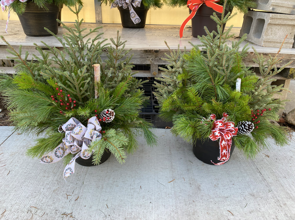 A stunning combination of fresh seasonal greens and decorative touches that bring natural beauty to your entrance all winter long.